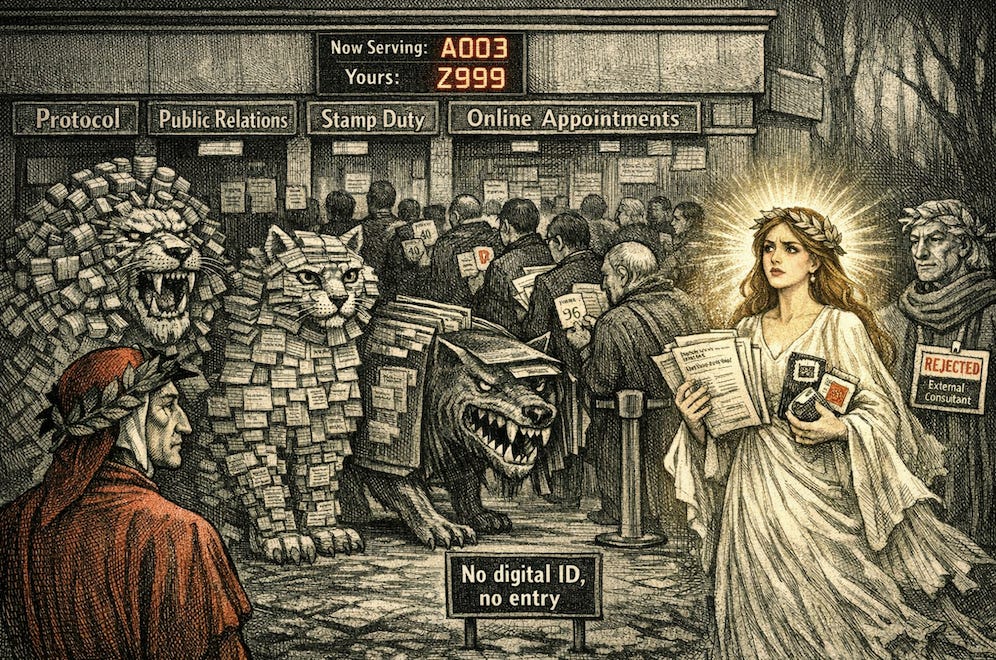 Più volte ho pensato che Dante fosse riuscito a sfuggire alle tre fiere e alla selva oscura solo perché ancora non esisteva la pubblica amministrazione: neanche Beatrice sarebbe riuscita ad aggirare (o far funzionare) il sistema.