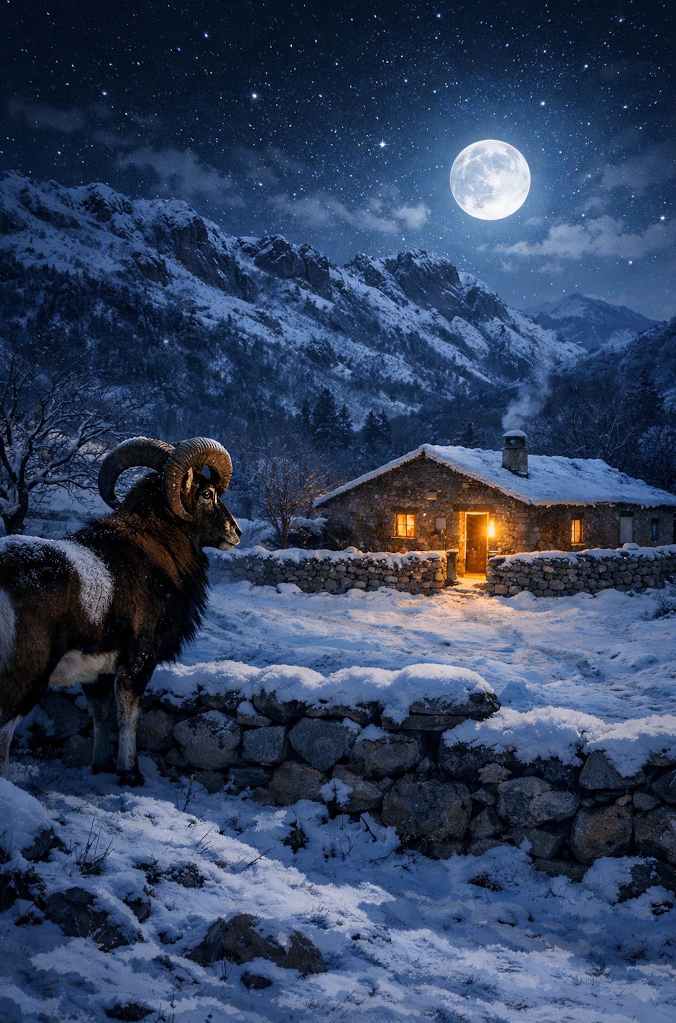 Allora si alzò e aprì la finestra. La notte era fredda, limpida, senza neve. Al chiarore della luna che illuminava la strada dei monti, la ragazza vide il muflone con gli occhi grandi e scintillanti. E penso che fosse lo spirito del suo fidanzato morto. Provò a farlo entrare in casa e ad avvicinarsi, ma il muflone affamato scappò. Allora la ragazza mise fuori dalla porta un canestro con fieno e orzo, e poco dopo sentì il ruminare del muflone. Così accadde la notte seguente, e anche la terza notte, ma decise di porre il canestro di fieno e orzo sulla soglia della porta aperta. La quarta notte il canestro era in cucina, la porta della casa spalancata, la bestia si fece coraggio ed entrò. A poco a poco, la ragazza e il muflone dagli occhi dolci divennero amici, lei si affezionò talmente al suo protetto che provò quasi sollievo alla sua pena. Lo aspettava tutte le notti, come un innamorato e non raccontava a nessuno del muflone comparso in una notte di luna.